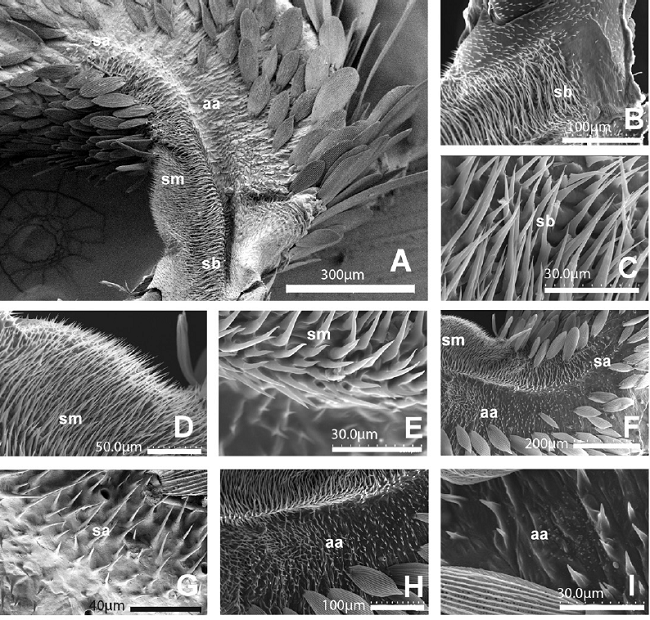 El área adyacente muestra proyecciones de longitud menor; en su mayoría se dirigen hacia el mismo sentido en el que se insertan las escamas del resto del palpo. Tales proyecciones se aprecian más espaciadas que en la superficie de la mancha, lo que permite ver la ‘topografía’ del tegumento, donde también se observan pliegues o surcos pequeños (Figura 5A, Figura 5H, Figura 5I).