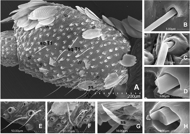 Las sensilas quéticas T1 encontradas son de 3 μm de diámetro (Figura 6A, Figura 6E, Figura 6F).