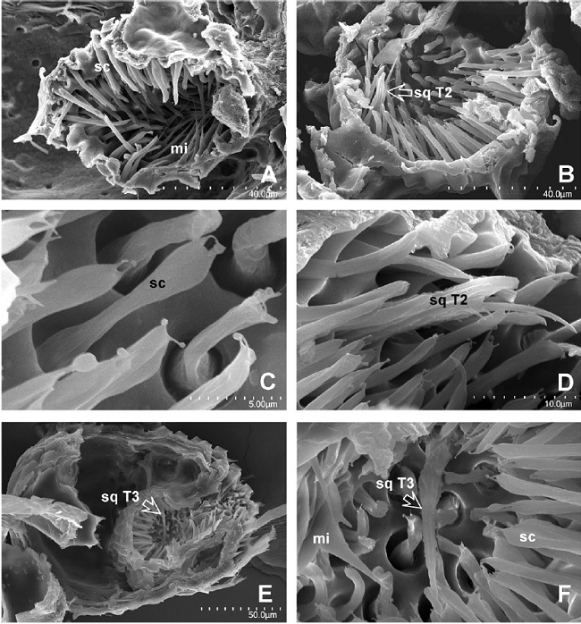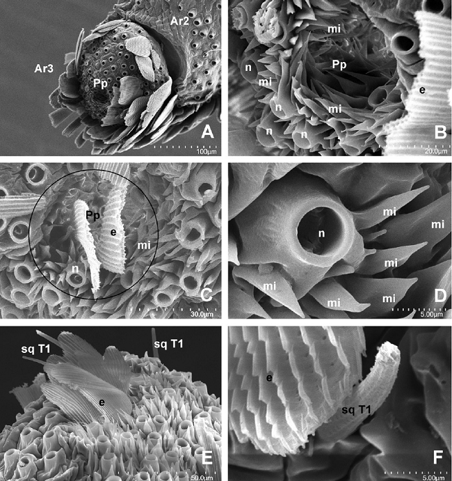 La distribución de sensilas dentro del Palp pit presenta entonces el patrón siguiente: en el fondo del órgano (mitad proximal) están insertas las sensilas celocónicas, mientras en la mitad distal se hallan las microtriquias. Las sensilas celocónicas (Faucheux, 1999) se encuentran separadas entre sí por una distancia de 2-3 μm entre cada alveolo; la cantidad aproximada es difícil de calcular, aunque puede estar en el intervalo 150-200. En la parte apical exterior del Palp pit se observaron algunas sensilas quéticas sq T1 (Fig 7E, Figura 7F).