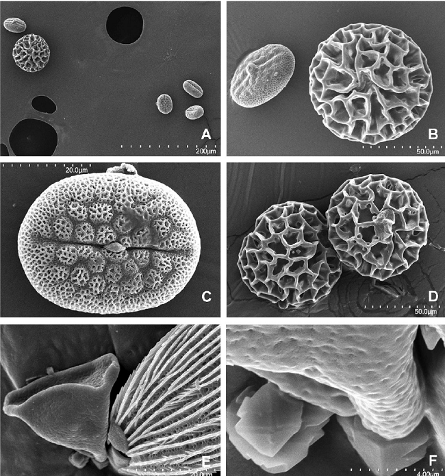 En la vista interna de los palpos, durante las disecciones al estereoscopio, se encontraron dos tipos de polen en más de uno de los ejemplares estudiados. Y un tercero en un solo ejemplar. Éstos pertenecen a plantas de las familias Acanthaceae, Polygonaceae (aff.) y Sapindaceae (Figura 9), visitadas por estos imagos que se adhirieron a los palpos posiblemente en el momento de alimentarse.
