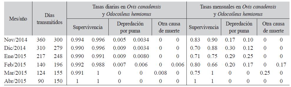 A 12 borregos (10 hembras y 2 machos) y a 10 venados bura hembras se les incorporaron collares de telemetría. De noviembre 2014 hasta abril 2015 se registraron 1 241 días transmitidos en los 12 borregos y 1 328 días transmitidos en las 10 venadas bura. La causa específica de muerte por puma en borrego fue 88 % (8/9), la tasa promedio diaria de supervivencia en borrego cimarrón fue de 0.9914 ± 0.0016 SD, la tasa promedio mensual de supervivencia fue de 0.79 y en la tasa mensual por depredación por puma tuvo rangos de 0.17 a 0.30 (Cuadro 1). En venado bura, la causa específica de muerte por puma fue 83 % (5/6). La tasa media de supervivencia diaria en venado bura fue de 0.9944 ± 0.0043 SD, la tasa media mensual de supervivencia fue de 0.86 y la tasa de depredación mensual por puma tuvo rangos de 0.10 a 0.17 (Cuadro 1). En las densidades, se estimó 0.77 borrego/km² y 7.0 venado/km². En el análisis de comparación entre las tasas de depredación por puma usando la prueba de Wilcoxon 95 % I.C., encontramos una diferencia significativa (Z = 1.826; df = 6; P = 0.05) siendo el borrego cimarrón la presa más selecta y de menor densidad.