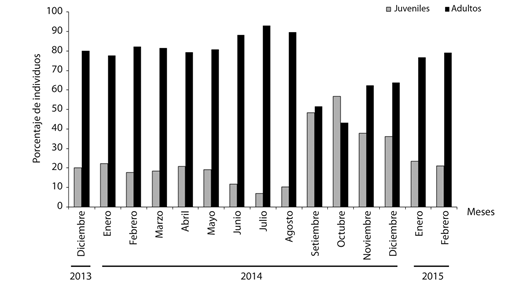 Subnicho etario de P. neglectus: Del total de observaciones realizadas durante el período evaluado, la población estudiada de P. neglectus estuvo constituida por el 24.71 % de juveniles y el 75.29 % de adultos. A excepción de octubre 2014, en los restantes meses muestreados los adultos fueron más numerosos que los juveniles. Los juveniles conformaron del 36.10 al 56.83 % de la población entre septiembre y diciembre 2014, indicando que en este período se efectuó el reclutamiento en la población. De junio a agosto 2014 se encontraron los mayores porcentajes de adultos con valores del 88.33 al 92.98 % (Fig. 1). Las mediciones conquiológicas realizadas presentaron mayores coeficientes de variación en los juveniles para las dos variables analizadas (Cuadro 1).