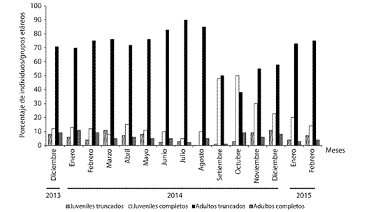 Del total de observaciones realizadas el 71.64 % de los moluscos presentaban las conchas truncadas. En octubre 2014 los juveniles completos (que representan la menor clase de edad) conformaron el 50 % de la población. Los porcentajes mensuales de los juveniles truncados y de los adultos completos no superaron el 11 % en el período de estudio. De junio a agosto 2014 se detectaron los mayores porcentajes de adultos truncados en la población, con valores del 83 al 90 % (Fig. 2).