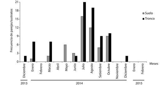 De acuerdo a la clasificación de Espinosa y Ortea (2009), P. neglectus es un molusco terrícola asociado a la vegetación. No obstante, la prueba de independencia con corrección de Yates demostró que de manera general en los adultos (X2 = 117.34, P = 0.0001) la frecuencia de utilización de un sustrato u otro depende de la ocurrencia de las precipitaciones. Del análisis de la figura 3 es posible plantear que el tronco de los arbustos y árboles constituye en la localidad estudiada el sustrato preferencial de esta especie para su reproducción (Fig. 3). La altura sobre el suelo de las parejas que emplearon el tronco como sustrato presentó un valor medio de 165.62 ± 61.27 cm.