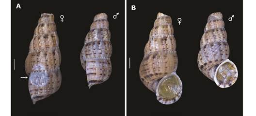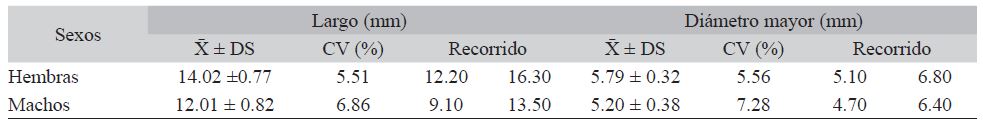 Dimorfismo sexual: La existencia de diferencias estadísticas significativas entre el largo (t = 19.45, P = 0.0003) y el diámetro mayor (t = 13.19, P = 0.006) de las conchas de las hembras y los machos confirmaron el dimorfismo sexual en la especie, resultando las hembras de mayores dimensiones respecto a los machos (Cuadro 3, Fig. 4).