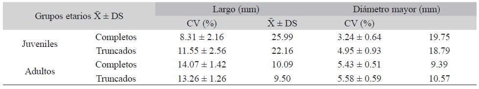 Las comparaciones del largo (t = 8.05, P = 0.007) y del diámetro mayor (t = 6.24, P = 0.0001) de los juveniles truncados y los juveniles completos mostraron diferencias estadísticas significativas, sugiriendo que ambos grupos representan dos clases de edades diferentes en la población. Los valores medios del largo de los adultos truncados y de los adultos completos fueron estadísticamente diferentes (t = 4.82, P = 0.002). Sin embargo, la comparación del diámetro mayor de sus conchas (t = 1.50, P = 0.16) demostró que conforman una misma clase de edad. La diferencia de las medias del largo de los adultos completos y de los adultos truncados apuntó que este grupo etario pierde aproximadamente 0.81 mm del ápice de la concha (Cuadro 1).