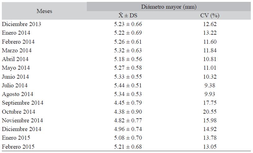 Las mediciones mensuales del diámetro mayor de las conchas de los moluscos confirmaron que en octubre 2014 ocurrió el pico del período de reclutamiento con un valor promedio de 4.38 ± 0.90 mm. En julio 2014 se observó el valor promedio más elevado del diámetro de las conchas (5.44 ± 0.51 mm), correspondiéndose con el período en el que se encontró la mayor cantidad de adultos en la población (Cuadro 2).