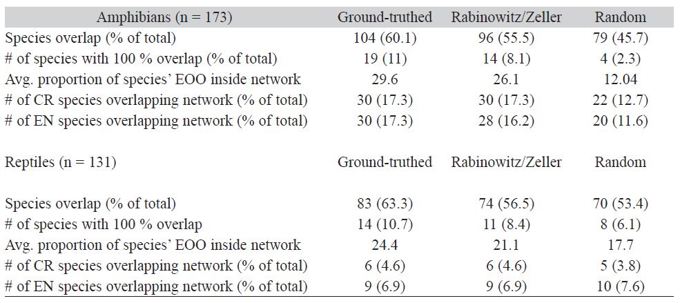 Umbrella results: Our analysis included 304 regional endemics - 173 amphibians and 131 reptiles. The IUCN classified 105 (60.7 %) of these amphibians and 34 (26 %) of these reptiles as Critically Endangered or Endangered. Species overlap, numbers of species with 100 % overlap, and the average proportion of species’ EOOs were greatest in the ground-truthed network (Table 1). The ground-truthed network had significantly higher coverage for Critically Endangered and Endangered amphibians than the randomly generated MBC network (one-way ANOVA, F 1,208 = 20.82, P < 0.001). Between the two networks, results did not differ significantly for Critically Endangered and Endangered reptiles (one-way ANOVA, F 1,66 = 2.25, P = 0.14). Reptiles were less represented than amphibians in terms of number of species overlapped despite having, on average, EOOs 4 times larger.