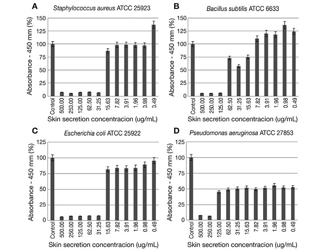 Determination of antimicrobial activity by the skin secretion: Overall, the amphibian skin secretion presented inhibitory activity against all indicator strains (Figure 1). In relation to S. aureus ATCC 25923 and E. coli ATCC 25922, no bacterial growth was observed for the following secretion concentrations: 500 μg/mL, 250 μg/mL, 125 μg/mL, 62.5 μg/mL and 31.25 μg/mL. Regarding to the B. subtilis ATCC 6633, the secretion inhibited its growth at concentrations ranging from 500 μg/mL to 125 μg/mL. It was verified a higher degree of inhibition (growth > 10 %) of P. aeruginosaATCC 27853 only at 500 μg/mL and 250 μg/mL dilutions. Thus, it was possible to determine the MIC for each tested strain: 31.25 μg/mL for S. aureus ATCC 25923 and E. coli ATCC 25922, 125 μg/mL for B. cereus ATCC 6633 and 250 μg/mL for P. aeruginosa ATCC 27853. All the results were statistically significant (p < 0.05) ( Figure 1 A, Figure 1B, Figure 1C and Figure 1D). The MBC values were 31.25 μg/mL, 62.5 μg/mL, 250 μg/mL and 500 μg/mL for S. aureus ATCC 25923, E. coli ATCC 25922, P. aeruginosa ATCC 27853 and B. cereus ATCC 6633, respectively.