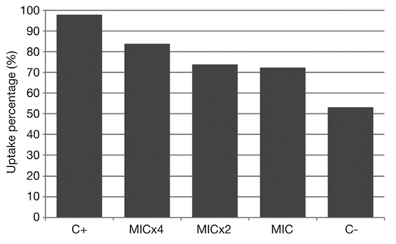 Crystal violet assay: The skin secretion exhibited activity on the cell envelope permeability of the S. aureus ATCC 25923, with this efficacy changing according to the evaluated concentration: 31.25 μg/mL (MIC), 62.5 μg/mL (MICx2) and 125 μg/mL (MICx4). The major percentage of crystal violet pickup was at 125 μg/mL, in other words, this concentration caused the greatest change in the cell envelope permeability of S. aureus ATCC 25923 compared to the other concentration values. In the absence of exposure to the skin secretion, the crystal violet absorption was 53.1 %. The treatment with EDTA resulted in an increasing of the absorption (97.7 %), when compared with the skin secretion treatment. The crystal violet absorption by S. aureus in presence of MIC was 72.3 %, rising progressively, 73.8 % for MICx2 and 83.8 % for MICx4 (Figure 2).