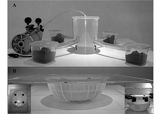Olfactometer for C. i. chevrolati:Ranjith’s proposal (2007) was followed to build an active olfactometer (with constant air flow) to allow the chemical stimulus to reach the DB (Finch, 1986). It consisted in a circular plastic chamber with a main central chamber (23 cm diameter x 20 cm high) and a cover. Four plastic tubes (2 cm diameter x 40 cm long) connected to the sides of this chamber, and at the end of each tube a square plastic container (13 x 13 x 10 cm high) was attached to hold the feces used as baits. These were covered with a ventilated top for air flow. Four centimeters of soil was placed on the floor of each container. To allow the beetles to detect the volatile compounds of feces, air flow in the central chamber was helped by an extraction fan attached through a hose to the upper portion of the cover. This produced constant air flow down the tubes towards the central chamber. A round subchamber (6 cm diameter x 6 cm high) with orifices held the beetles and allowed them to detect volatile before release into the olfactometer (Figure 1A).