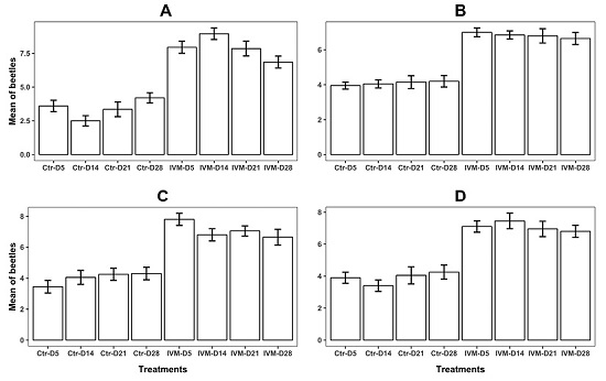 Data collection and analysis: For experiments 1 and 2, a generalized linear model with a Poisson error distribution was used to analyze the principal effects of three factors on the number of dung beetles attracted to feces: a) feces with two levels (from IVM-treated animals and from non-treated animals); b) beetle sex with two levels (female and male); and c) dpt with four levels (5, 14, 21 and 28). The statistical analyses were run separately for each species.