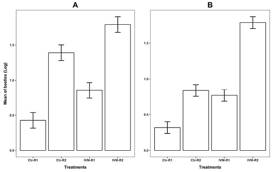 For experiment 3, a two-way ANOVA was applied to analyze the principal effects of feces with two levels (from IVM-treated animals and from non-treated animals); and ranch with two levels (R1 and R2) on the number of dung beetles attracted to feces. To meet the assumptions required by the ANOVA, the number of beetles was log-transformed.