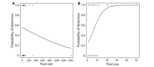 Statistical analyses: To test the effect of the number of larvae or nymphs included in pools on the probability of detecting Rickettsia, we used General Linear Models with a binomial distribution. We run two separate analyses for larvae, the first included pools from 3 to 55 larvae, and the second from 3 to 1427. Thus, the first group of larvae pools is similar in range to the pools of nymphs. We used the R statistical language, version 3.0.1 (R Development Core Team, 2014) for analyses.