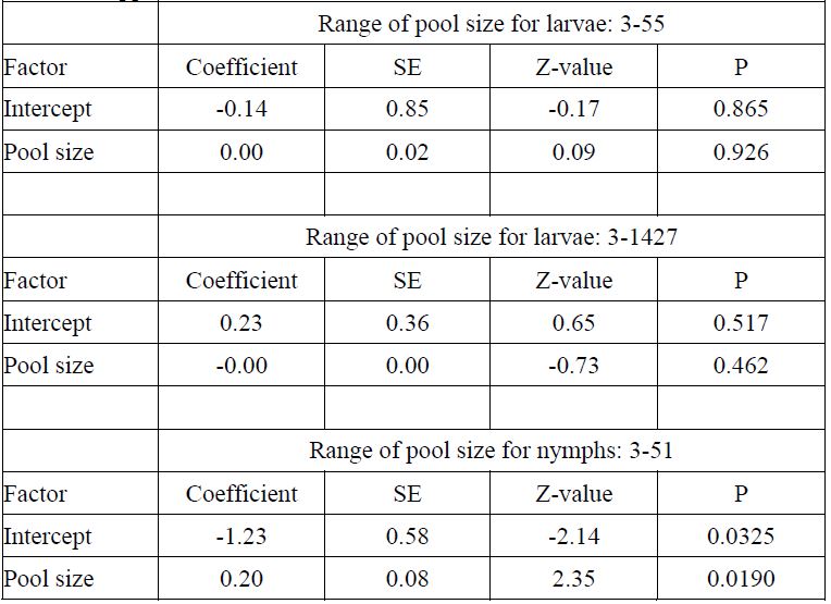 Based on our data, the number of larvae placed in a pool does not affect the probability of detecting Rickettsia. Thus, a few individuals in each pool would be enough to detect the presence of Rickettsia. However, if the interest is in detecting Rickettsia from nymphs, pools with 10 nymphs yield a probability of detection of about 0.50, and with 20 nymphs in the pools the probability of detection is close to 1. In this case, more than 20 nymphs did not improve the probability of detection.