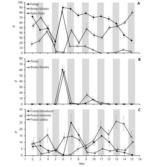 Fenología: Se seleccionaron en un área boscosa de crecimiento secundario 20 árboles reproductivos, con flores o frutos tanto adheridos al tronco como caídos en el suelo bajo la copa. Cada árbol se georreferenció, para ubicarlo más fácilmente, se marcó y numeró. Se realizaron observaciones mensuales desde febrero de 2015 hasta marzo de 2016. Las fenofases evaluadas fueron: follaje, brotadura foliar, brotes de flores, floración, frutos inmaduros, frutos maduros adheridos a cada árbol y frutos caídos, de la última cosecha, en el suelo bajo la copa. Estas fenofases se observaron a lo largo del tiempo con una modificación del método semicuantitativo de Fournier (1974), con escala de 0 a 4, donde 0 es ausencia del carácter; 1 es presencia del carácter de 1 a 25 %; 2 es presencia de 26 a 50 %; 3 de 51 a 75 % y 4 de 76 % a 100 % del evento. Además, se evaluó el daño mecánico y por herbivoría en el follaje, que se cuantificó con una escala de 0 a 1, en la que 0 significa sin daño foliar y 1 corresponde al 100 % del follaje dañado. Para analizar los datos se calcularon los promedios de los valores porcentuales de las fenofases, para convertir las variables en continuas. Así se obtuvo el porcentaje de cobertura en los árboles.