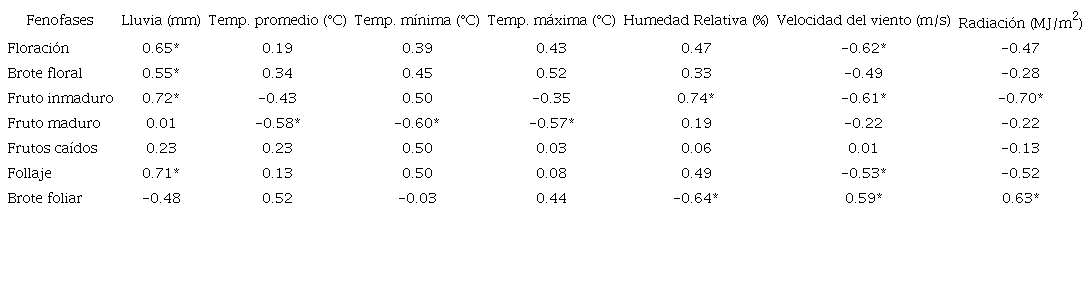 Según el criterio de selección de coeficientes, tenemos algunas correlaciones estadísticamente significativas entre fenofases y variables climáticas (Tabla 1) y se identificaron las más importantes (r > 0.60). La mayor precipitación se correlacionó con un aumento en la producción de hojas y flores y la presencia de frutos inmaduros. A mayor humedad relativa, mayor número de frutos inmaduros y menor porcentaje de brotes foliares. Al aumentar la velocidad del viento se redujo la floración y el número de frutos inmaduros. La mayor radiación solar se correlacionó con menor número de frutos inmaduros y aumento de la brotadura foliar.