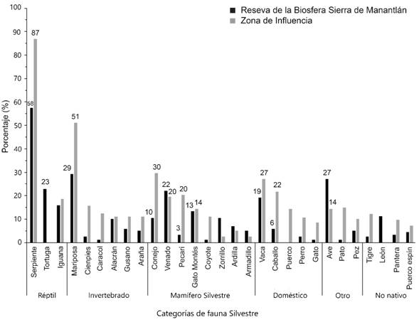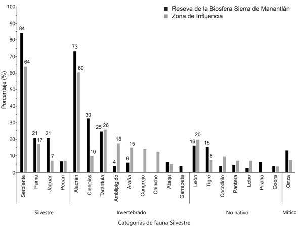 Pregunta 1. Animales que viven cerca de la comunidad (cerro, monte, bosque o selva): En la zona de estudio, el jaguar es percibido en muy bajo porcentaje como parte de su entorno natural; dentro de la RBSM solo lo dibujaron el 3.6 % de niños y en la zona de influencia (ZI) el 2.9 %. Las serpientes fueron las más dibujadas en la ZI por el 87 % de los niños; mientras en la RBSM fue un 58 %. Las mariposas fueron más dibujadas afuera (51 %), que adentro (29 %). Dentro de la reserva el 7 % dibujó al pecarí; mientras en la ZI, lo dibujó el 20 %. En cuanto a animales no nativos, en la RBSM se dibujó al león africano (11 %) y al tigre asiático (12 %), como parte de su entorno. Además, más niños dibujaron animales no nativos dentro de la RBSM: a) oso y puerco espín en dos ocasiones y b) lobo, pantera, camello, elefante, cocodrilo y tucán. En la ZI, EL 8.8 % dibujaron a la pantera y el 2.9 % a la cobra (Fig. 1 y Fig. 2).
