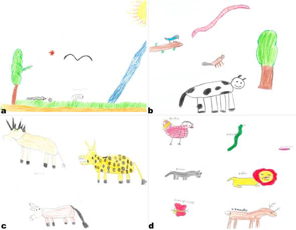 Por otro lado, el segundo animal más dibujado en el entorno, fue la mariposa. Atribuimos que esto representa un estereotipo de dibujo del campo: un paisaje con montañas, sol, nubes, pasto, árboles y mariposas, el cual es influenciado en parte por los libros de texto que muestran un entorno típico de los ecosistemas con estos elementos. Los niños en la ZI identifican varias especies de animales domésticos en el entorno: perros, gatos, puercos, caballos y vacas (29 %), mientras en la RBSM solo identificaron a las vacas (17 %) como parte del entorno. Esto puede responder a que en ambientes más transformados (ZI) haya menos fauna silvestre y es más común observar los animales domésticos. Es extraño que en la RBSM en ninguna ocasión se dibujó al pecarí, mientras el 20 % de los niños de la ZI, lo dibujaron. Una posible explicación es que es resultado de los conflictos con pecaríes, ya que en la región los agricultores los perciben como una plaga que consume sus cultivos (Santana, Íñiguez-Dávalos, & Navarro, 1990). En la ZI hay más cultivos, cerca de vegetación natural o de crecimiento secundario, mientras que en la RBSM hay más vegetación natural menos perturbada y pocos cultivos. Y es que en áreas tropicales los pecaríes persisten en bosques perturbados, con cultivos, de los cuales se alimentan y por esta razón también en el sur del país los agricultores los consideran una plaga (Reyna-Hurtado & Tanner, 2005; Pérez-Cortez & Reyna-Hurtado, 2008).