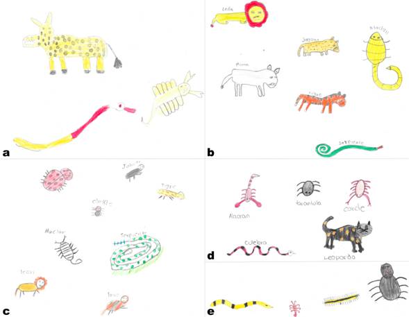 Los animales considerados más peligrosos fueron: a) las serpientes, el 84 % de los niños las dibujó en la RBSM y 64 % en la ZI; b) los alacranes con un 73 % en la RBSM vs 60 % en la ZI; c) ciempiés 33 % en RBSM vs 10 % en la ZI y d) las tarántulas con un 25 % en la RBSM y 24 % en la ZI (Fig. 3).