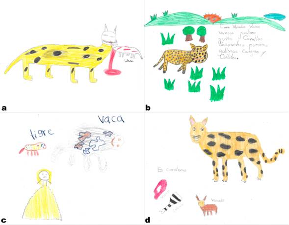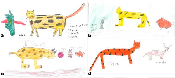 A los niños se les pidió que dibujaran: a) ¿Qué animales viven en el cerro/monte cerca de su comunidad? Cerro y monte, es como localmente se conoce al área que no es la urbanizada, incluye los bosques, selvas, vegetación perturbada b) ¿Cuáles son los animales más peligrosos que viven en el cerro/monte cerca de su comunidad? c) ¿Cómo es el jaguar? d) en el mismo dibujo del jaguar, se les pidió que dibujaran “lo que come el jaguar”. En las preguntas a y b, los niños tuvieron 25 minutos para dibujar, mientras en c y d, 15 minutos. En cada dibujo los niños anotaron su nombre, edad y grado escolar.