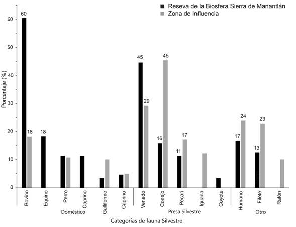 Las respuestas de los niños sobre las especies silvestres presentes en la dieta del jaguar en la RBSM fueron más precisas respecto a la importancia que los animales tienen en la dieta del jaguar. Solo mencionaron las principales presas del jaguar, aunque el orden de importancia invertido, los venados cola blanca (Odocoileus virginaianus) con mayor porcentaje y pecarí de collar (Pecari tajacu) en segundo lugar. Los estudios ecológicos de la dieta del jaguar, indican que el pecarí de collar es la presa principal, mientras el venado cola blanca es de la segunda a la quinta en importancia (Núñez, Miller, & Lindzey, 2000; Rueda, et al., 2013; Hernández-SaintMartín et al., 2015). En la ZI de un 6-12 % consideran que el jaguar come serpientes, pastos, elementos que no son parte de la dieta del jaguar en México, o que come iguanas, las cuales aportan un porcentaje bajo de biomasa a su dieta (Núñez et al., 2000; Rueda et al., 2013; Hernández-SaintMartín et al., 2015). Además, los conejos (Sylvilagus sp.) fueron los más mencionados en la dieta, pero en realidad rara vez los consumen, según estos estudios. Estas percepciones pueden ser resultado de datos imprecisos que tienen los campesinos del jaguar, pues las percepciones sobre él, se construyen por la historia oral y no por observación directa (Álvarez et al., 2015).