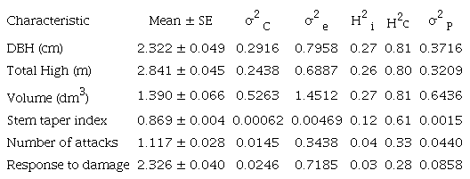 Estimation of genetic parameters is crucial to defining breeding strategies and estimating the genetic value of progenitors (Osorio, White, & Huber, 2001). When characteristics of resistance to pests is included in genetic breeding programs, greater gains in growth are obtained (Swedjemark & Karlsson, 2004). The objective was to estimate expected genetic gain when clones resistant to attack by Hypsipyla grandella were selected by calculating heritability and genetic correlations of diameter at breast height, tree height, volume and trunk taper index, number of attacks and clone recovery from damage by H. grandella.