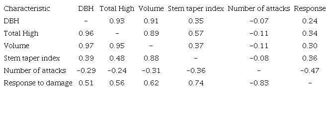 Response of the clones to H. grandella attack positively correlates, phenotypically and genetically, with taper index, diameter, height and volume. This means that the clones that repair the damaged area by quickly reestablishing apical dominance, or by evading attack, will grow more. Genetic correlation between response to and incidence of attacks was negative and high; that is, when selecting materials with better response, the propagules should have fewer attacks, and viceversa.