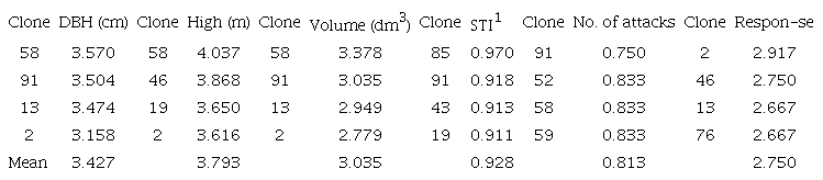 Genetic gain: Expected genetic gain in volume was two times more than in diameter at breast height and almost three times that of height, and 13 times greater than that expected for response to attack (Table 4). By using the four best clones in volume, a genetic gain of 82 % will be obtained in this variable, while if large-scale planting of the four with best recovery from H. grandella attack, gain would be only 6.3 % in reaction to damage.