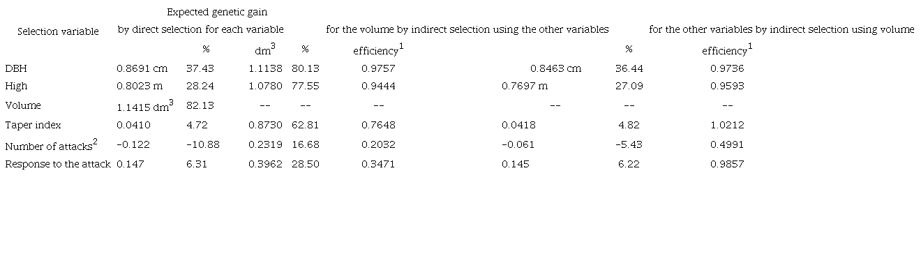 Volume was the variable with the largest gains. However, genetic gain by indirect selection may make it sufficient to measure only diameter at breast height (DBH) for improving this species. Operatively, it is much faster and economical to measure only diameter at breast height. Moreover, the efficiency of measuring only DBH to predict tree height was 0.96 % (28.24 % of genetic gain by direct selection vs. 27.23 % by indirect selection with DBH, data not shown) and 0.81 % of gain between DBH and response to attack.
