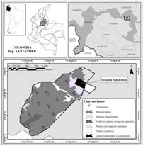 Área de estudio: en la cordillera Oriental, municipio de Bolívar (departamento de Santander), vereda Puerta de Los Cerros, en bosque de 100 ha, contiguo a la estación Santa Rosa (06°8 N y 73°49 W, Fig. 1). De acuerdo a Holdridge (1987) es un bosque muy húmedo subtropical (bmh-ST), y según Cuatrecasas (1989), es una franja subandina, entre 1 400 y 1 800 m, con precipitaciones entre 2 000 a 3 000 mm/año y 18-24 ºC. Con afloramientos rocosos que alcanzan hasta 20 m de altura, y algunas plantas crecen y se adhieren a ellas, cubriéndolas casi en su totalidad (Gil-Novoa et al., 2017; Patiño-B., 2004).