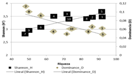 Diversidad: De las 10 unidades muestreadas, siete tienen valores más altos en diversidad y bajas dominancias (transectos del 1-5, 8 y 10, con riquezas entre 65-92 especies). Los transectos con mayor dominancia fueron 6, 7 y 9 (0.08-0.11 D), y menor riqueza (48-57 especies; Fig. 2). Las especies más dominantes son: Triolena hirsuta (Benth.) Triana (286 individuos), Pilea sp2 (256), Chamaedorea pinnatifrons (Jacq.) Oerst. (256), Miconia sp5 (144) y Piper eriopodon (Miq.) C. DC. (84).
