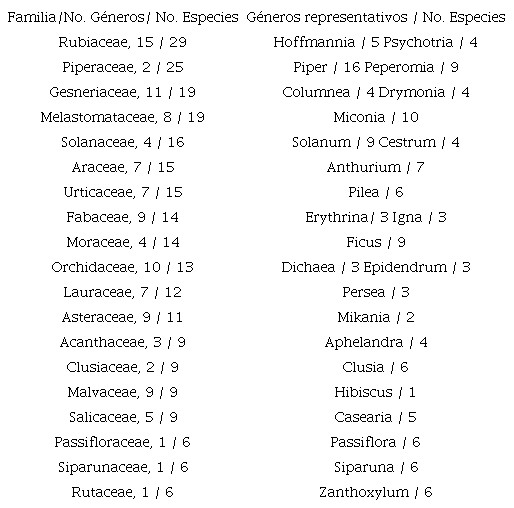 Los géneros con mayor riqueza de especies son Piper (16 especies), Miconia (10), Ficus, Peperomia, Solanum (9), Anthurium, Clusia (7), Passiflora, Siparuna, Pilea y Zanthoxylum (6); El 23 % de las especies están en los 15 géneros más ricos (111; Cuadro 1). El 29 % de los géneros (74) con dos a cuatro especies (204) y el 65 % restante (168) con una especie.