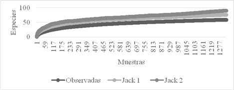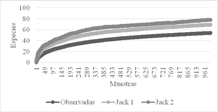 Se realizó una curva de acumulación utilizando los estimadores no paramétricos Jacknife 1 y Jacknife 2, mediante el programa Estimates 9.1.0 (Colwell, 2013). El grado de cambio o reemplazo en la composición de especies entre comunidades del paisaje (diversidad beta) fue estimado mediante el coeficiente de similitud de Jaccard (Moreno, 2001). La tasa de captura se calculó a partir del número de días en los cuales se registró la presencia de la especie sobre el total de días en los cuales la cámara trampa permaneció activa por 100 (Moreira et al., 2007).