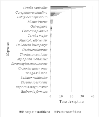 En las pasturas exóticas, las mayores tasas de captura corresponden a Leptotila verreauxi (17.26 %), Furnarius cristatus (11.95 %), Ortalis canicollis (11.48 %), Aramides ypecaha (11.48 %), Columbina picui (8.43 %), Coryphistera alaudina (6.17 %) y Turdus amaurochalinus (4.29 %), mientras que las especies detectadas en una única ocasión fueron Eudromia formosa, Crypturellus tataupa, Butorides striatus, Ardea alba, Nycticorax nycticorax, Cairina moschata, Rupornis magnirostris, Geranospiza caerulescens, Crotophaga ani, Crotophaga major, Lepidocolaptes angustirostris, Elaenia spectabilis, Myiodynastes maculatus, Knipolegus striaticeps, Cyanocorax chrysops, Saltator multicolor y Coryphospingus cucullatus (Fig. 3).