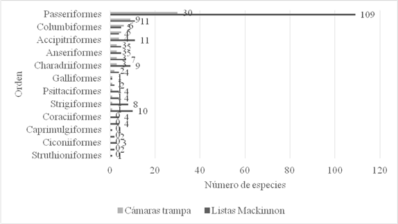 Las cámaras trampa registraron un mayor número de especies de los órdenes Tinamiformes y Columbiformes que las listas Mackinnon. Esto indica que el fototrampeo constituye un método apropiado para la detección de los taxones referidos. Las especies de los demás órdenes fueron registradas mayormente a través de listas Mackinnon, por lo cual este método fue más efectivo para determinar la diversidad del área de estudio (Fig. 4).