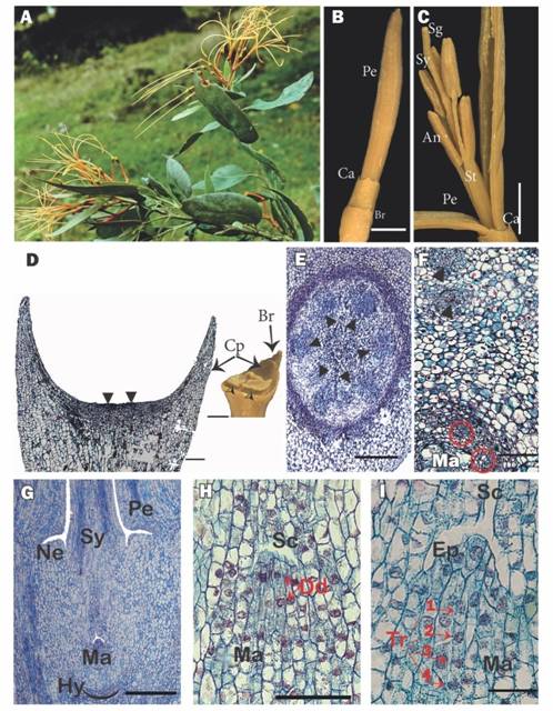 Nectary, style and stigma: Between the petals and the style base, an annular nectary is present (Fig. 1G). The style is initially hollow, but later the internal epidermal tissues join and, together with the amiliferous parenchyma that surrounds them, form an internal transmission tissue (Fig. 2D). Surrounding this are 4-5 vascular bundles, and more externally, two to three layers of typical parenchyma and finally a thick-walled epidermis whose cells have a prominent external cuticle (Fig. 2D). The slightly differentiated stigma and has extremely rounded cells (not shown).