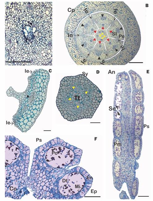 Cupular pedicel and inferior ovary: For the centrally inserted flower of the triad, the cupular part of the pedicel with its associated bracteole shows vascularization up to half of its length (Fig. 1D). For flowers in anthesis, the floral base below the hypostase consists of a uniseriate epidermis, formed by small, quadrangular cells with very thin external cuticles and irregular internal faces, followed by two to three layers of parenchymatous cells similar in size to the epidermis, which in turn are succeeded by large parenchymatous cells forming 10-12 layers of tissue, and, finally, a ring formed by eight layers of small and tanniferous parenchymatous cells. Internally, surrounded by typical parenchyma, there are six collateral vascular bundles and a central parenchymatous cortex (Fig. 1E).