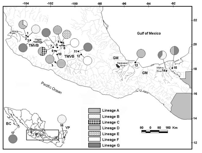 Phylogenetic relationships and specimen identification: The mtDNA trees produced by BI and ML were identical for all the analyses. The mitochondrial COI gene retrieved seven major lineages (A-G) which are genetically divergent (> 10 %) (Fig. 3). Lineage A was formed by only one individual from Charco 1 (Fig. 3, see also Fig. S3). Lineage B is represented by 20 samples from four locations (La Colorada, La Vega, Vernet and Parque Ecológico) (Fig. 3). Lineage C includes eight samples from La Zarcita spring, being the sister group with high support of the lineage D. Lineage D includes 43 samples from six locations (Escondida, La Zarcita, Uranden, Magdalena, La Colorada and Yuriria) (Fig. 3). Lineage E form a group composed by 11 specimens in one haplotype from La Joya Maar Lake. Finally, two genetically divergent lineages, F and G are sister clades. The lineage F that includes 58 samples from Cuitzeo and Lerma and the lineage G that is represented by 35 specimens collected in five locations (Atotonilco, Ixtlahuaca, Vernet, El Rosario and Teremendo) (Fig. 3). Uncorrected p distances for mtDNA gene within the seven lineages ranged from 0-3.1 %, whereas, pairwise distances among the seven lineages ranged from 12-18 % (Table S3).