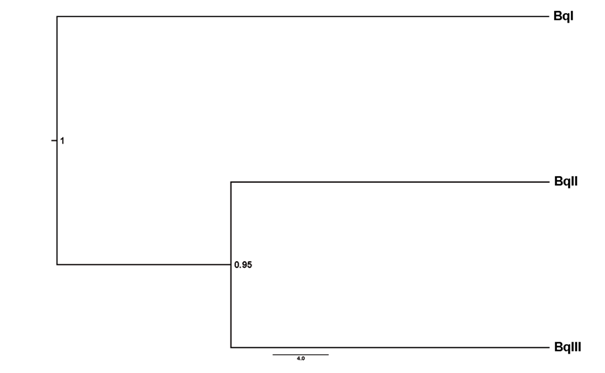 The species tree analyses reveal that the most supported hypothesis is that of 18S rRNA that supports the presence of three putative species with high branch support > 95 % (see Fig. 2). We called these three putative species BqI, BqII and BqIII (see Fig. 2 and Fig. 4). For the six putative species hypothesis (see Fig. 3 and Fig. S2), the branch support was < 75 % for some of the branches (Fig. S2).