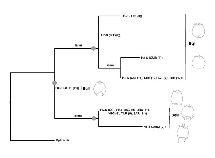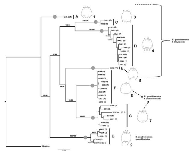 The topologies reconstructed by BI and ML methods for the 18S gene were identical and revealed a polytomy comprising three lineages that we called BqI, BqII and BqIII (see above) (Fig. 4). Percentages of uncorrected distances among the three ribosomal lineages ranged from 0.3-0.5 %. Lineage BqI is formed for all specimens identified as B. quadridentatus f. cluniorbicularis and include the mitochondrial lineages F and G. Lineage BqII was identified as B. quadridentatus f. brevispinus and is concordant with the mitochondrial lineage E. Finally, lineage BqIII encompasses all specimens belonging to lineages B, C, and D in mtDNA analyses. This latter lineage is a mix of specimens identified as B. quadridentatus quadridentatus and B. quadridentatus f. brevispinus (Fig. 4).