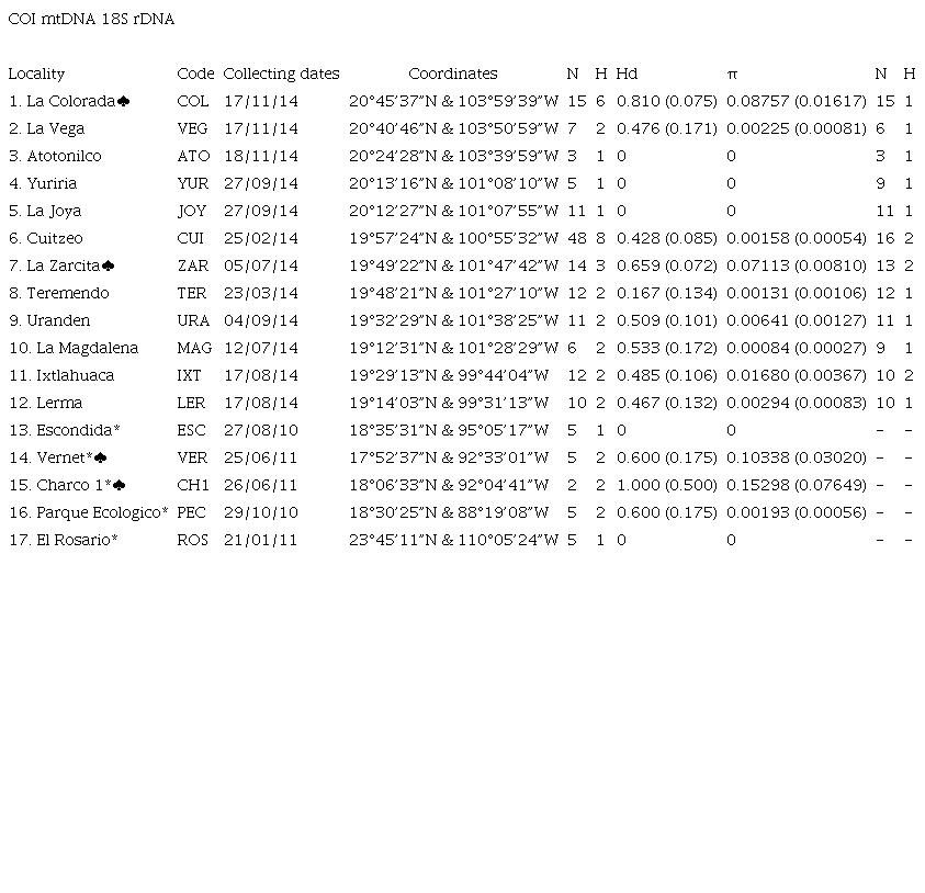 Sequence variation: The final alignment for the mitochondrial COI gene had 635 bp, with 242 polymorphic sites and 233 parsimony informative sites, defining 38 unique haplotypes from 176 sequences (154 de novo and 22 from GenBank). For the nuclear 18S gene 830 bp were obtained, with eight polymorphic sites and seven parsimony informative sites defining seven haplotypes from 125 sequences (all de novo). Most mtDNA haplotypes were unique for a single population, but two haplotypes were shared between two populations that belong to the same watershed (COLVEG1 and VERCH1-1) (Fig. 1; Table S1). Cuitzeo Lake had the highest number of mitochondrial haplotypes (8) followed by La Colorada Lake (6) (Table 1). Cuitzeo was also the site with the highest number of specimens. The highest number of nuclear haplotypes (2) was found in the Cuitzeo, La Zarcita and Ixtlahuaca sites (Table 1).
