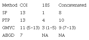 Species delimitation: The number of putative cryptic species based on COI gene sequences ranged from seven to 13 (Table 2, Fig. S1). The ABGD method discriminated seven, the GMYC method revealed 11 putative species (confidence interval: 5-13, likelihood ratio: 11.15828, LR test: 0.00377), whereas SP and PTP methods delimited 13 putative species (Fig. S1). For 18S rRNA, estimates of putative species ranged from one to four (Table 2, Fig. S1). Statistical Parsimony revealed a single species, whereas the PTP model delimited four putative species. The GMYC model found three putative species (Table 2, Fig. S1) (confidence interval: 1-5, likelihood ratio: 0.23773, LR test: 0.88792). The concatenated dataset detected similar number of putative species as the COI analyses, with exception of those samples in which 18S sequences were not available.