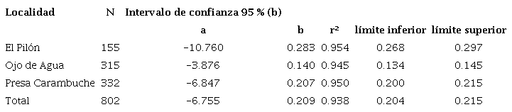 La relación longitud patrón-peso estuvo determinada por la ecuación no lineal, W = 0.00000768*LP3.386 (Fig. 3); demostrándose un crecimiento de tipo alométrico positivo (b > 3; t = 20.75, P < 0.01). A nivel de población, los parámetros obtenidos a partir de los análisis de este tipo de regresión se presentan en la Tabla 2, donde todas las poblaciones mostraron un crecimiento de tipo alométrico positivo (P < 0.01) con valores de “b” entre 3.126 (Ojo de Agua) y 3.420 (El Pilón). Los valores de “b” fueron diferentes entre las poblaciones El Pilón y Ojo de Agua (t Student, 5.89, P < 0.01), así como entre la población El Pilón y Presa Carambuche (t Student, 5.130, P < 0.01); sin embargo, los valores de “b” entre las poblaciones Ojo de Agua y Presa Carambuche fueron similares (t Student, -1.67, P > 0.05).