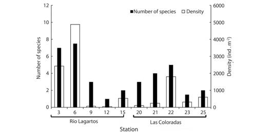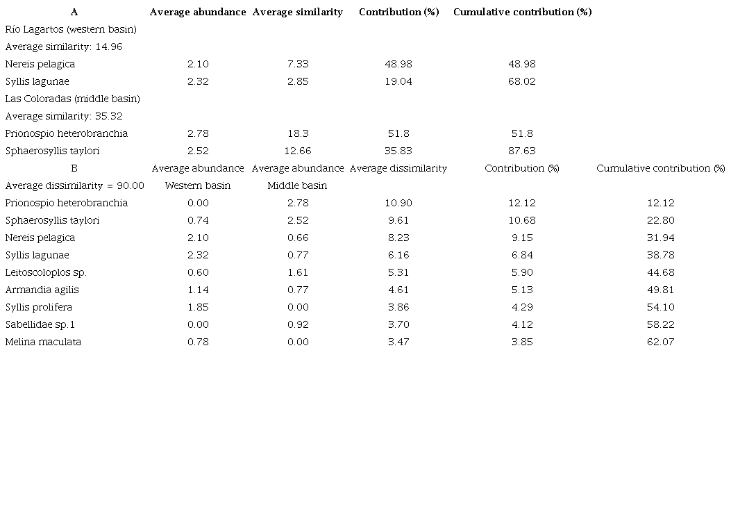 The Río Lagartos lagoon system harbors a highly heterogeneous polychaete community, especially near the lagoon mouth, likely associated to the strong variability of environmental characteristics. Strong gradients in environmental abiotic (salinity and sediment grain size) and biotic (abundance of subaquatic vegetation) characteristics between basins defined strong changes in species composition. Yet, the particular effect of each environmental factor cannot be singled out, and it is the interaction among them and with the particular lifestyle and biology of each species that define the distribution of each population.