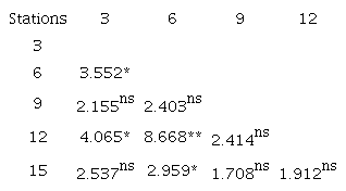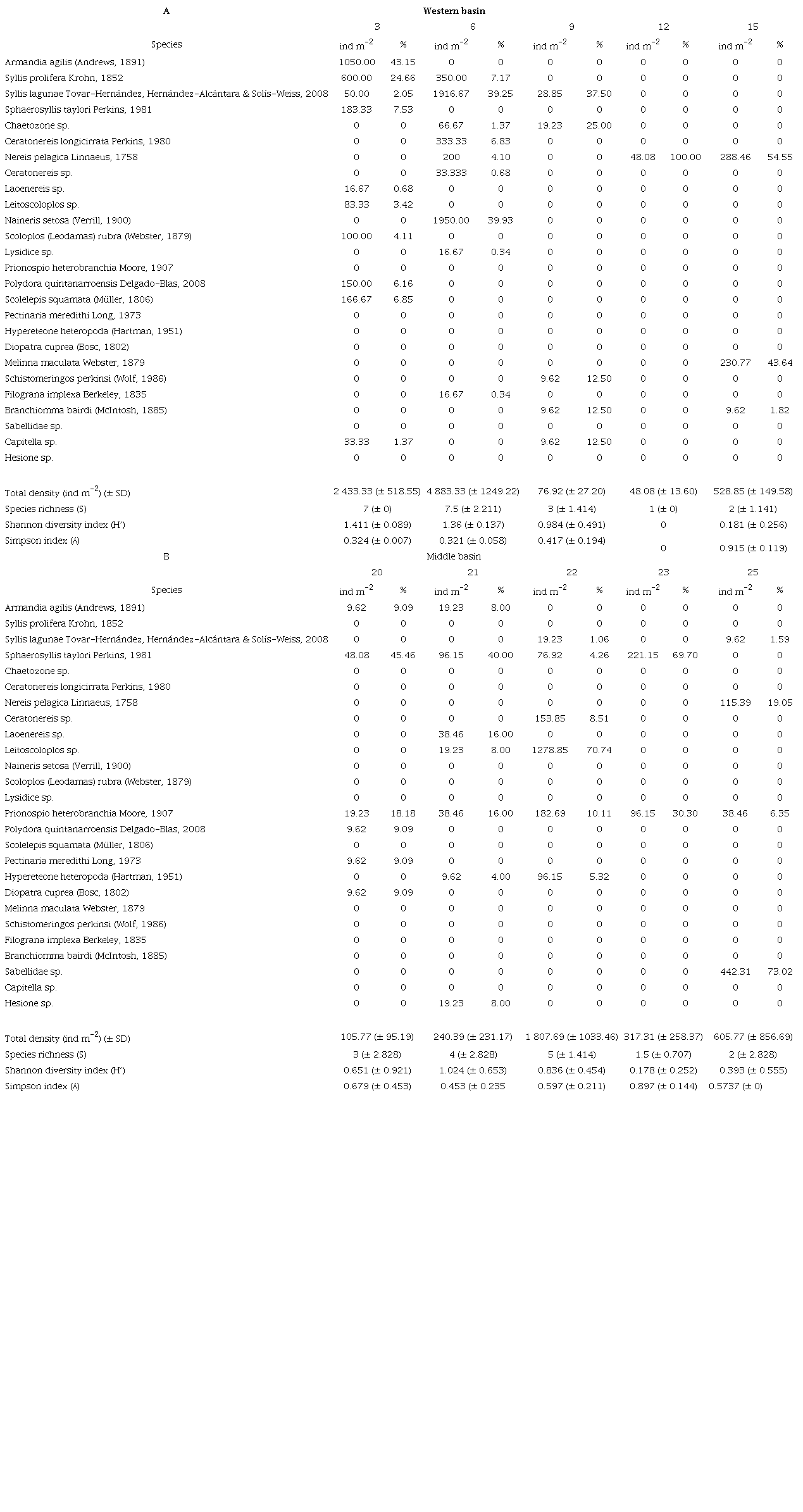 The one-way PERMANOVA performed to test the influence of sampling gear on the community composition revealed non-significant effect (p > 0.05). Therefore, the following analyses were performed using data from both gear. Empty samples easterly from station 25, where polychaetes were not present, were discarded from the further analyses. The nMDs (Appendix 2) performed on the density data showed grouping of the polychaete assemblages according to their location inside each basin. Samples from the middle basin were mostly at the left of the plot and those from the western basin, at the right side. No clear pattern in samples distribution was identifiable in the vertical axis, related with a high variance among samples from the western basin (Appendix 2). Cluster analysis revealed that the polychaete assemblage at station 3, the station nearest to the mouth of the system, was similar to those found in the middle basin, whilst the one found at station 25, which was the easternmost site where polychaetes were collected, grouped with stations from the western basin (Appendix 2). The two-factor PERMANOVA proved significant differences in polychaete assemblages between basins (pseudo-F1,19 = 7.17; Monte Carlo p < 0.01) and between the stations located within each basin (pseudo-F8,19 = 2.70; Monte Carlo p < 0.001). Pairwise comparisons between stations revealed significant differences between some stations in the western basin (Table 3) and homogenous polychaete assemblages in the middle basin (Monte Carlo p > 0.05 in all cases). PERMDISP revealed non-significant differences in multivariate dispersion between basins (t = 2.190; p = 0.06), even if values were higher in the western basin (48.32) when compared to the middle basin (39.04). SIMPER analysis revealed high dissimilarity between both basins in terms of species composition (average dissimilarity = 90.00 %) (Table 2). Yet, intragroup similarities at the western (14.96 %) and middle (35.32 %) basins were low, suggesting high heterogeneity in species composition among stations within each basin. At the western basin, the polychaete assemblage was mainly defined by the occurrence of Nereis pelagica Linnaeus 1758 (48.98 %) and Syllis lagunaeTovar-Hernández, Hernández-Alcántara & Solís-Weiss, 2008 (19.04 %), while at the middle basin, Prionospio heterobranchia Moore, 1907 (51.80 %) and Sphaerosyllis taylori Perkins, 1981 (35.83 %) were the characteristic species. These four species were also the ones that mainly contributed to dissimilarity between the two basins (38.78 %), P. heterobranchia being absent from the western one.