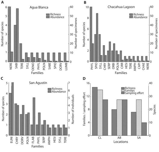 As results for each site, Chacahua Lagoon had the highest richness and abundance with 37 taxa and 149 specimens. In Agua Blanca 21 taxa and 92 specimens were identified, and from San Agustín, 19 taxa and 32 specimens. Nereididae was the family with highest richness (six species) in Agua Blanca, whereas Sabellariidae presented the highest relative abundance (58 specimens) (Fig. 1A). In Chacahua Lagoon, Phyllodocidae was the richest family (10 species) and Spionidae had the highest abundance (53 specimens) (Fig. 1B). In San Agustín, Eunicidae had the highest richness and abundance (four species, seven specimens) (Fig. 1C). Lumbrineridae, Chaetopteridae, Capitellidae and Sabellidae had the lowest abundance in these locations, with only one specimen each one.