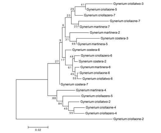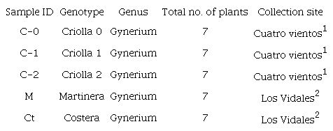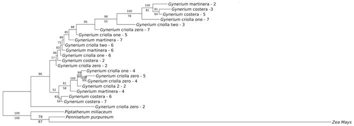 Plant material, DNA extraction, PCR amplification and sequencing: A total of 35 foliar tissue samples were included in the study. Seven specimens of each were analyzed, from “Criolla 0”, “Criolla 1”, “Criolla 2”, “Martinera”, and “Costera”, genotypes that belong to the Gynerium sagittatum species. The samples of “Criolla 0”, “Criolla 1” and “Criolla 2” were collected in the Cuatro Vientos, San Andres de Sotavento, located at 50 m.a.s.l. The samples of “Martinera” and “Costera” were collected in the Los Vidales, Tuchín, located at 70 m.a.s.l. Collections were made in the Zenues indigenous reservation of the Córdoba department, Colombia (Table 1).