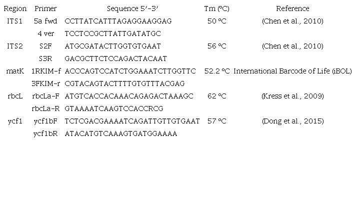 Data analysis: DNA barcodes candidates were edited using the BioEdit software, version 7.0.9.0 (Hall, 1999). Also manual adjustments were made. All sequences were deposited in the GenBank (APPENDIX 1). Informative polymorphic characters were identified by MEGA6 (Tamura et al., 2013). Alignment of the sequences was performed using the MUSCLE alignment tool (Edgar, 2004). The different locus combinations were taken into account for the evaluation of the model independently in each marker. The barcode analysis was calculated using the Kimura 2-Parameter (K2P) model (Kimura, 1980). The effectiveness of the regions (ITS, ITS2, matK, rbcLa, ycf1) and their combinations as barcodes was evaluated using three different methods.