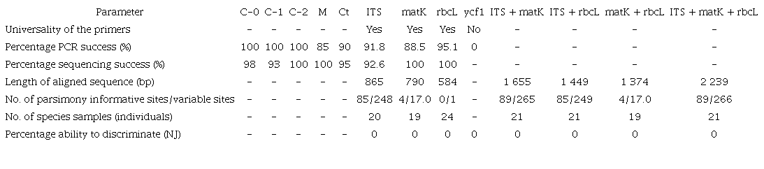 Results: The results showed that BM and BCM approaches revealed the low rate of correct species identification for ITS+matK (33.3 %) and ITS (28.6 %) loci, showing similarity among sequences. These results were further supported by tree-based analyses, where all individual regions and the different gene combinations had a zero discrimination rate.
